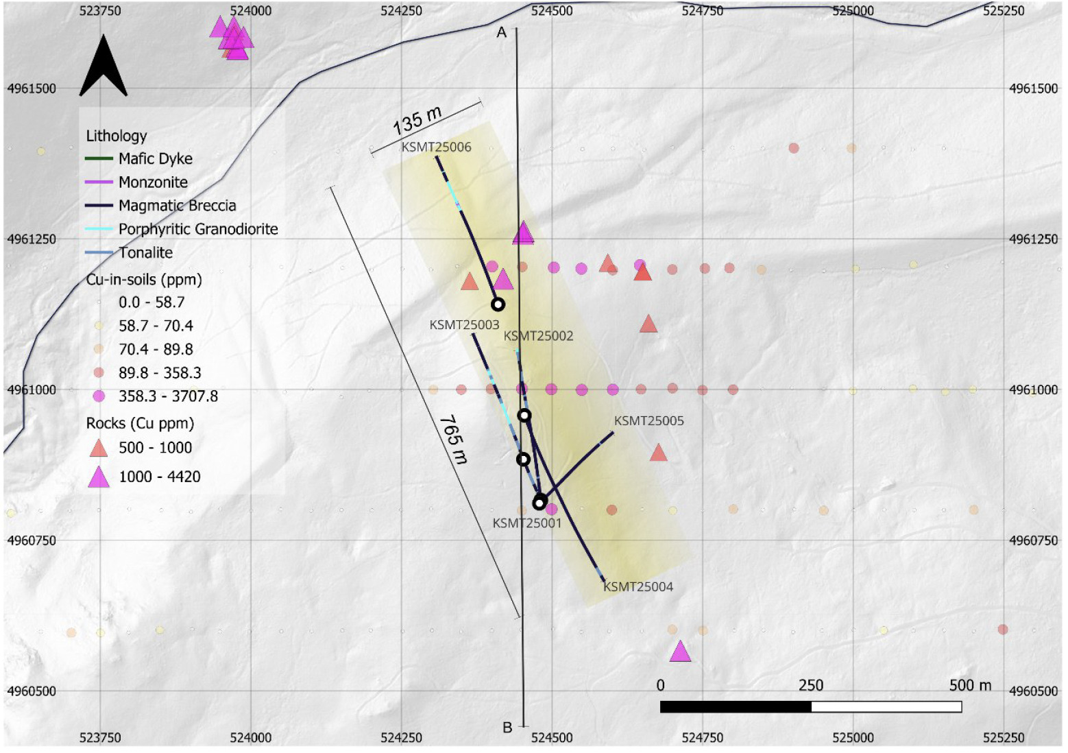 - Drillhole KSMT25004 was collared approximately 75 metres north of KSMT25003 and drilled at an azimuth of 160 degrees to the southeast. The objectives of the hole were to test the extent of the breccia complex in this direction and to determine whether the weakly-to-moderately-mineralized tonalite encountered in KSMT25001 continued to the southeast.