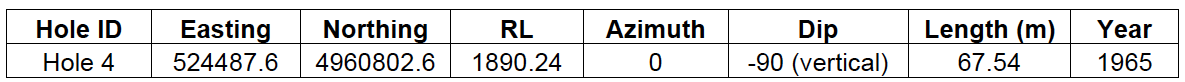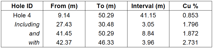 Table 1. Significant intercepts in historical drill hole 4 at the Kismet Target