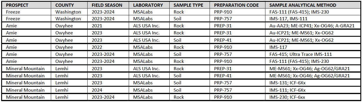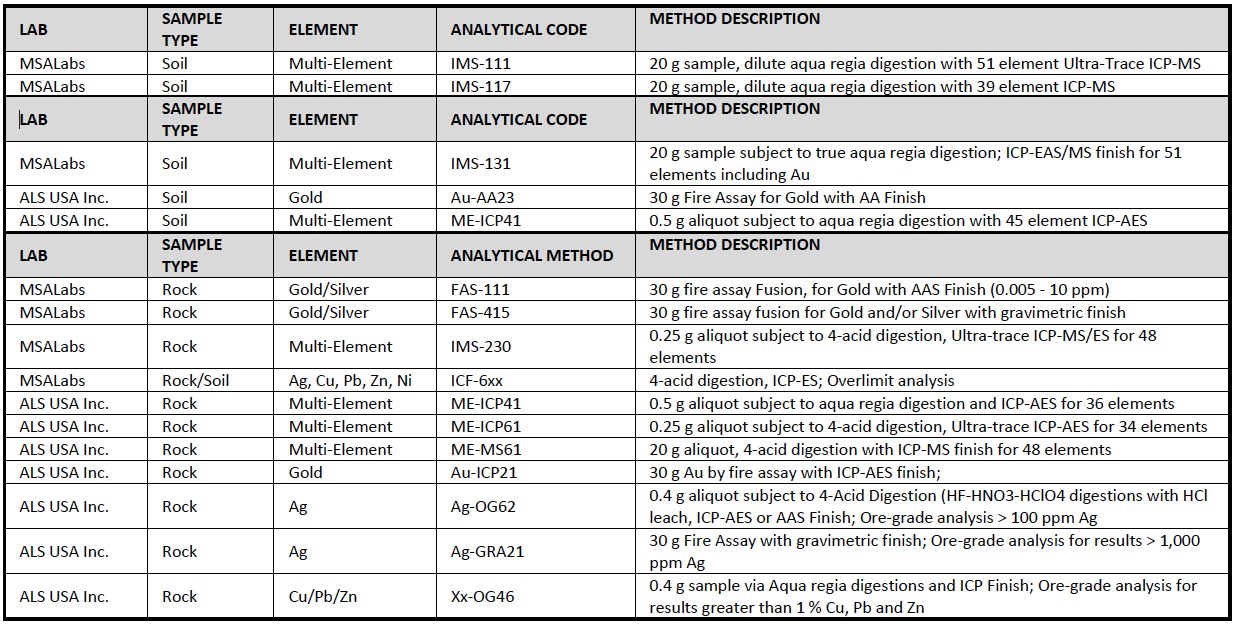 Rock samples were collected from outcrop, float, historic workings, and mine dumps, placed in plastic bags, sealed, and labeled. All samples were georeferenced using a handheld GPS, stored securely during field campaigns, and shipped to the laboratory at the conclusion of each program or as appropriate. Due to the complexity of multiple years, labs, sample types and analytical procedures, the company has elected to present a summary description of these details in the following tables. Grab samples are selected samples and may not represent true underlying mineralization.