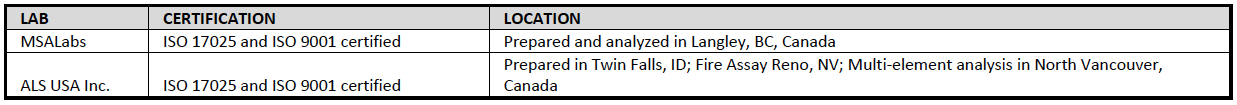 During earlier exploration programs, the Company relied on the internal QA/QC protocols of the laboratories. Both MSALabs and ALS USA Inc. include internal standards, duplicates, and blanks in the sample stream at set frequencies. These internal control samples are reviewed prior to the release of assay certificates and are included with the laboratory reporting, which has been reviewed by the Company’s Qualified Person.